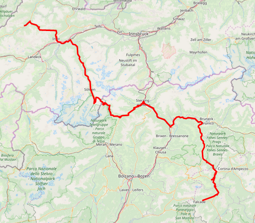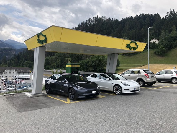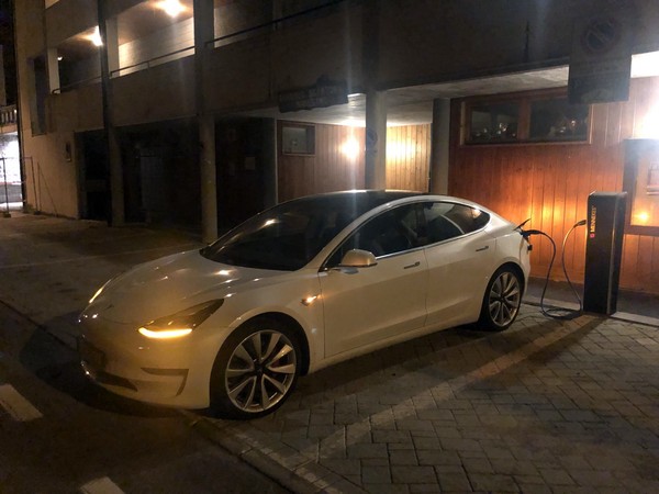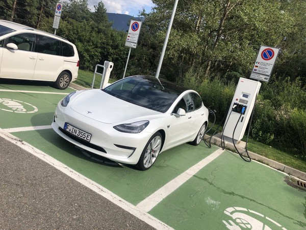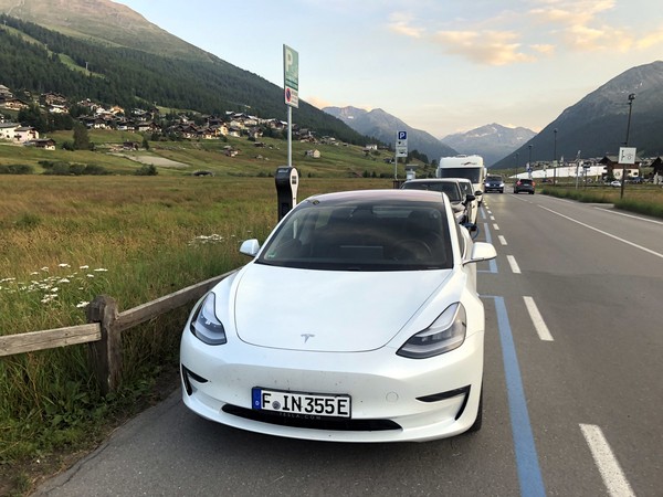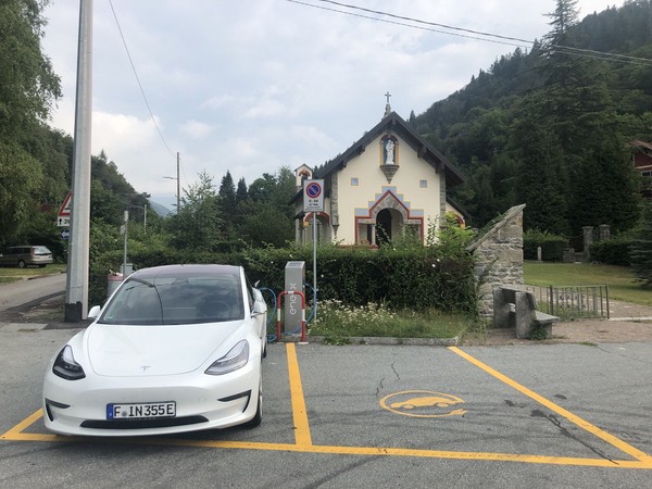 Our overall track was a little chaotic :) We did not touch any highways, the whole trip was on B-roads only, with dozens of mountain passes and other twisty roads. It all started in Reutte, Austria, just south of the German border where I arrived from…First charge after arrival: a Tesla destination charger at a hotel in Holzgau, over dinner. Weird setup with the 3 chargers on the corner… I guess two of them are really usable? I only needed one.Day 0 - from initial meetup in Austria to Falcade, Italy Link to heading