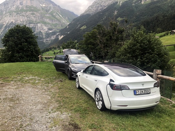 Brief stop at a high-power charger in Thusis, Switzerland. Gotta love the Model 3’s CCS compatibility.After some shenaningans with fully-booked camping grounds, we finally arrived at a place in Grindelwald that had room to spare. The Model 3 has been promptly upgraded to a “small mobile home” alongside the S-Max, and I got to try sleeping in it for the first time.This worked better than expected. Next time I need a thinner mattress to allow my knees more than an inch of room before hitting the shelf above the trunk, but otherwise it was really nice. Having the heater run through the night definitely added some comfort, since the temperature dropped to below 10° before morning - fellow travelers in their tents were slightly jealous.