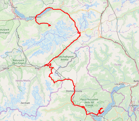 After overnight rest, the Day 3 route took us on a very non-direct path, first heading north past Interlaken, around the Brienz lake and then south towards Italy and Lago Maggiore.Views were enjoyed as we crossed the Grimsel pass. The pass itself was less enjoyable due to horrific traffic, mostly caused by an enormous amount of cyclists slowing everyone down to a crawl. The group rarely traveled in one big convoy, mostly we got split up in small-ish groups by traffic or unplanned photo stops.Only recharge on Day 3 at a petrol station in Brig, before climbing up the Simplon pass towards Italy. Up there, beautiful landscapes and amazing weather - we were really lucky on this trip. For the most part.Day 4 - break and excursion further south Link to heading