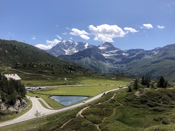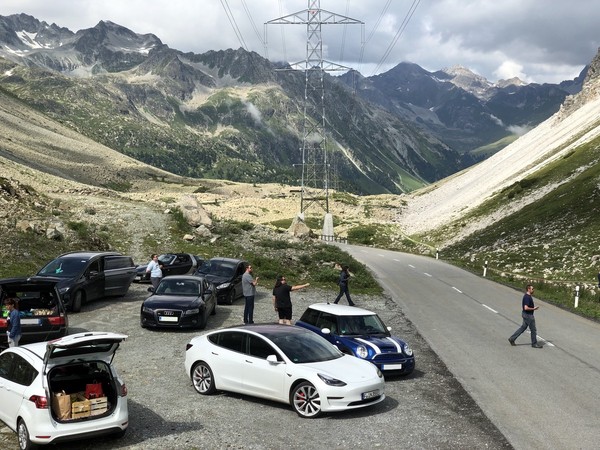 On Day 5, we headed north-east, crossing into Switzerland and back into Italy again near the end of the day.As we crossed the San Bernardino Pass, it slowly began to cloud over. Still made for a nice picture. Or several.Our overnight stay, quite literally at the end of the road - the tunnels and the rest of Spluga pass heading down were blocked off for construction. Allowed us a very quiet night at least. And a decent view downhill from the apartment, only a short walk away - note the waterfall on the right.In the evening we drove up the Spluga pass and had dinner at the top. Nice panorama of the wide nothingness there.While we were having dinner, the Model 3 recharged at a yet another free Type 2 spot down in Madesimo. The signs said it’s limited to 2 hours, but the charger stayed powered for all 3.5h that I needed to top the charge off to 90% and enjoy some pizza.