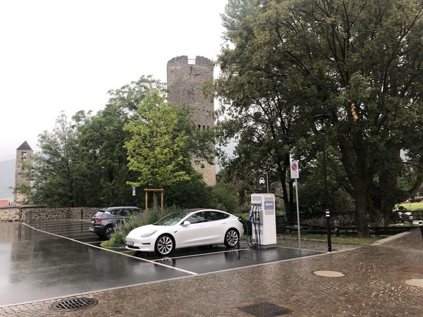 One more recharge later in the day at a motorway toll station near Bressanone. This one was also 50kW strong, and free! Not much to do at the location though, so after a regroup and plan check we quickly left.