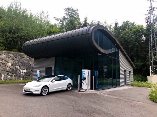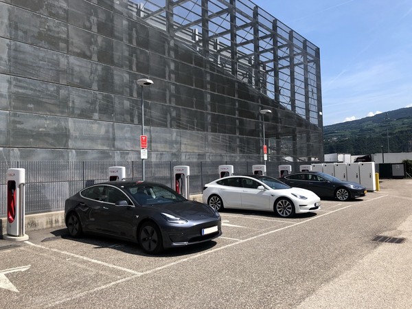 Day 1 route headed west from Falcade towards Trento, before climbing into the mountains and turning north-west, ending in Livigno behind the picturesque Foscagno pass.One of very few Tesla Superchargers that I used on the trip, near Trento. Located next to the highway in an industrial area, at least there’s a hotel with facilities and a snack bar to spend the short recharge time before moving on.